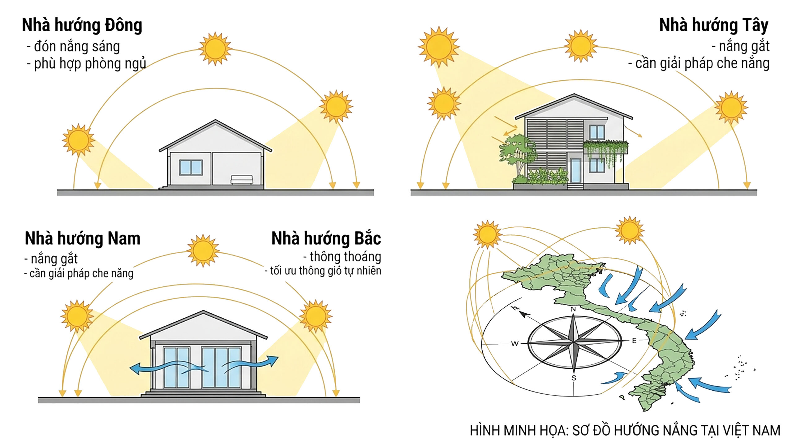 Nhà hướng Nam: thông thoáng → tối ưu thông gió tự nhiên)
