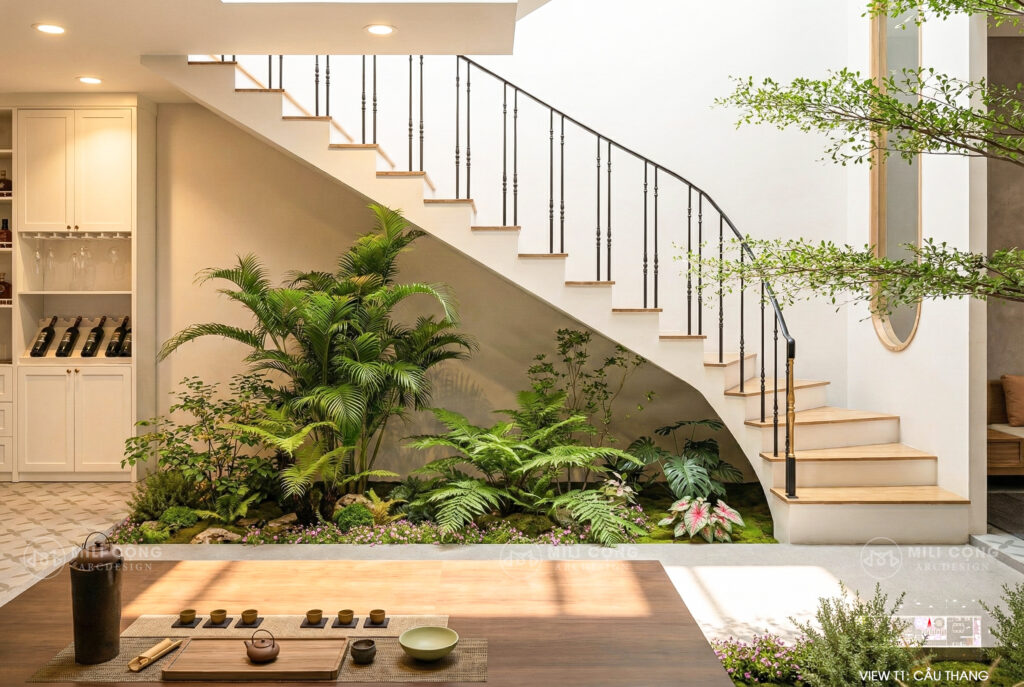 Khoảng không gian xanh được bố trí ở cầu thang , lấy nắng , lấy gió vào công trình nhà phố